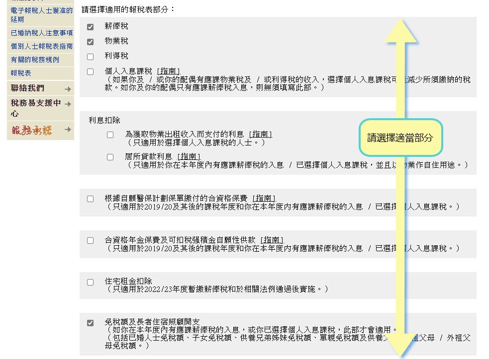 步驟1. 在選擇報稅項目時,記緊剔選「利息扣除」下的「居所貸付利息」。