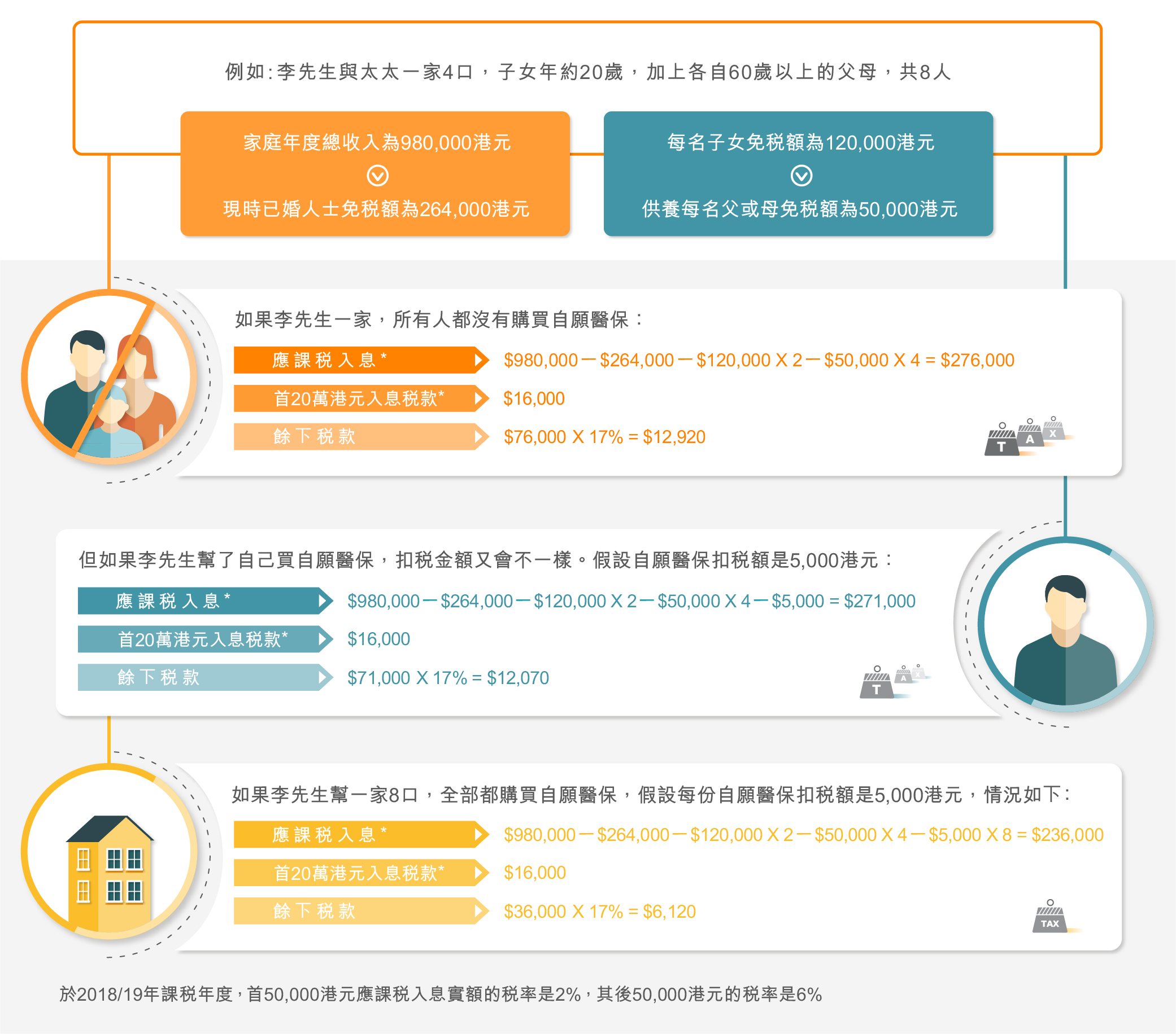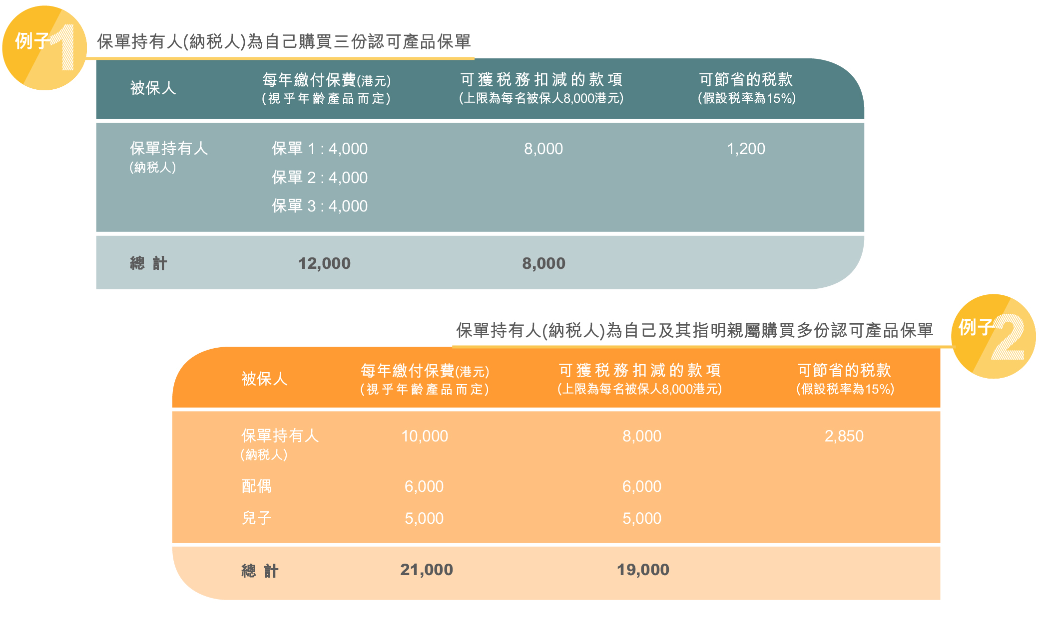 但緊記扣稅款額是以每名受保人為單位,不可組合使用,每年的上限為每名受保人8,000港 元。即使三份自願醫保的保費分別為5,000港元,6,000港元及10,000港元,當中10,000港元超出了8,000港元的上限,但超出款額不能填補其餘兩份保單的扣稅款額,因此扣稅款額只是 $5,000 + $6,000 +$8,000 = $19,000。