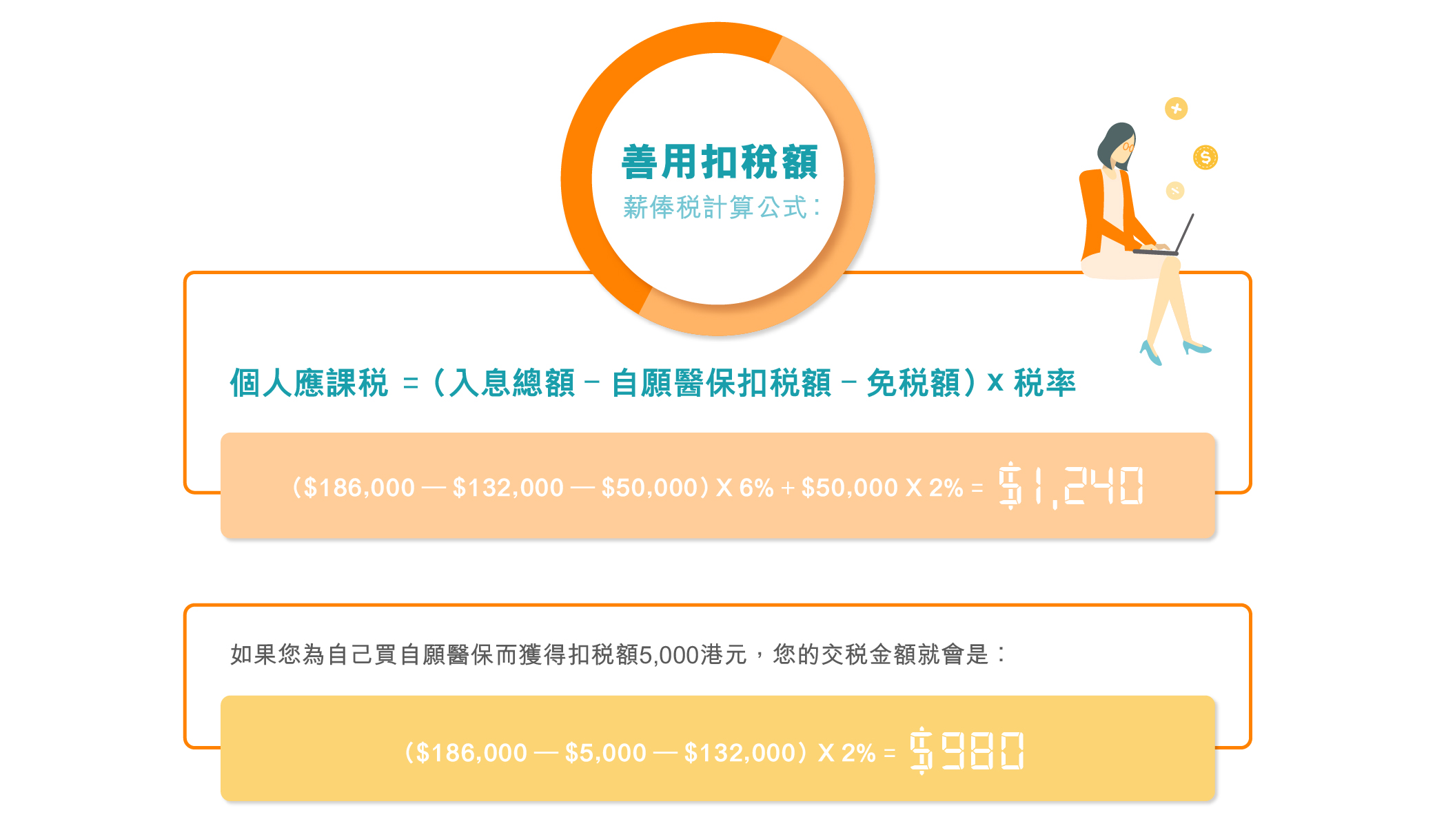 如果您為自己買自願醫保而獲得扣稅款額5,000港元,您的交稅金額就會是︰($186,000 – $5,000 – $132,000)X 2% = $980