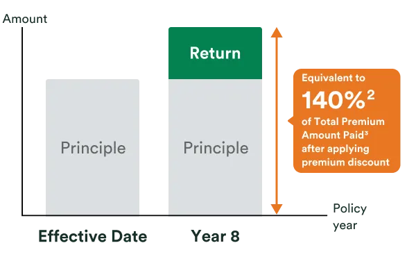 Regardless of any claims made, up to 108% refund of Total Premium Paid at maturity.